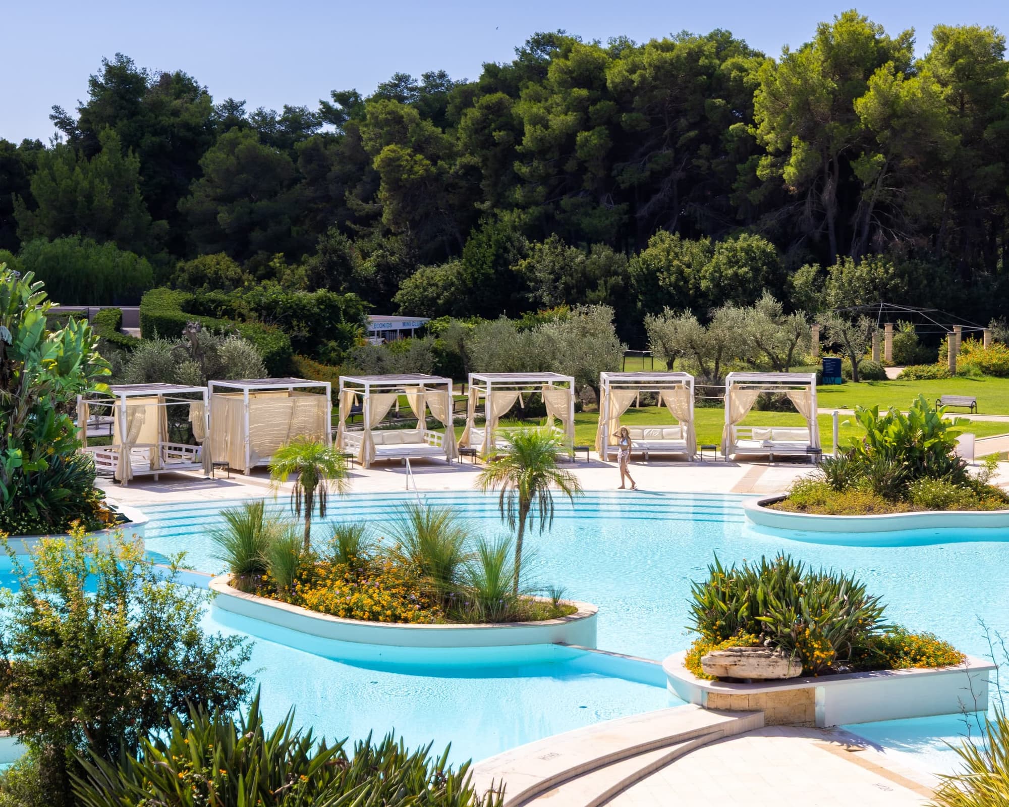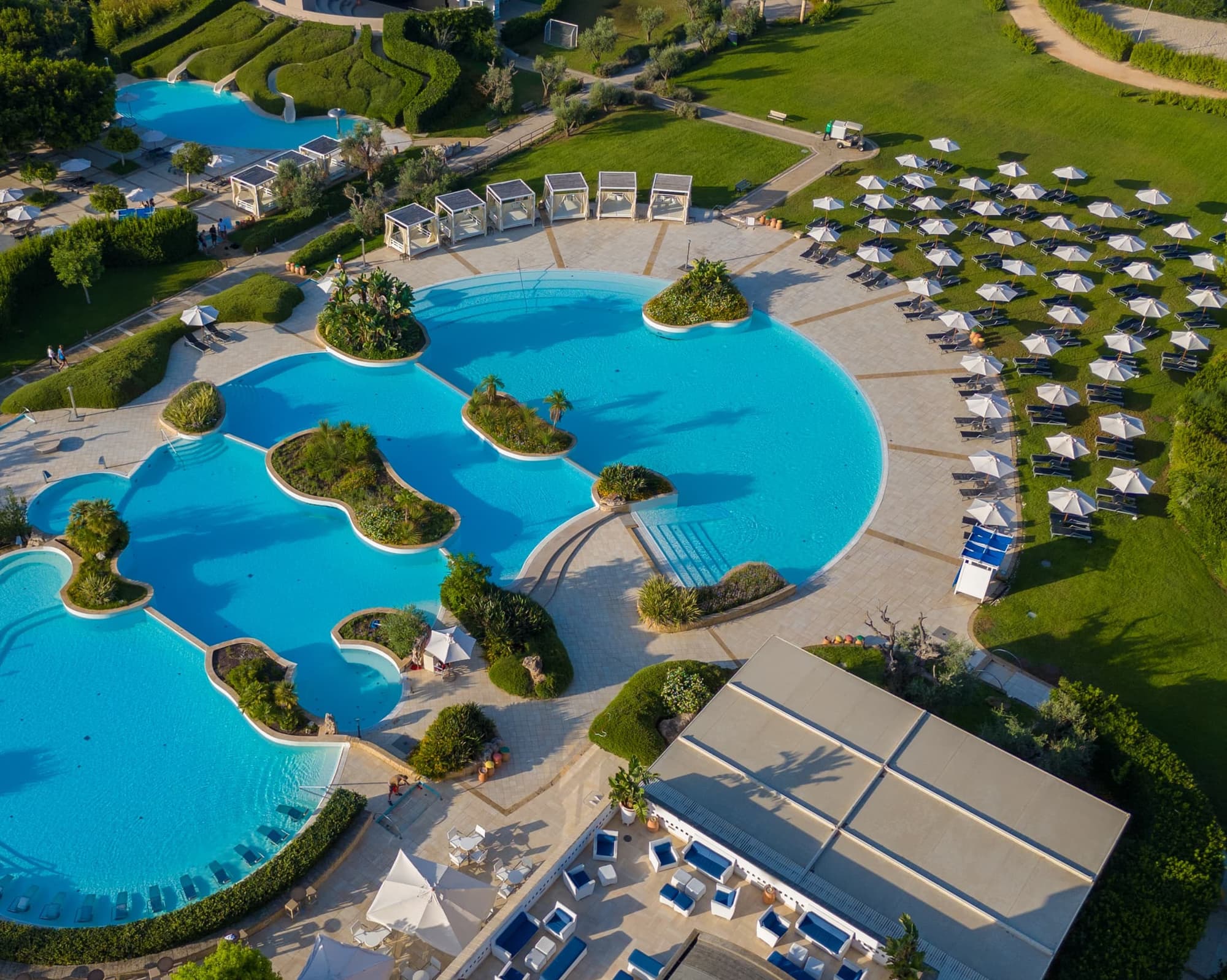 • Immensa piscina centrale con quattro vasche disposte su più livelli e separate da giardini fioriti, di cui una leggermente riscaldata in bassa stagione, con lettini idromassaggio e cascate d’acqua. Una piscina con scivoli d’acqua per i ragazzi e una piscina per bambini profonda 40 cm e parzialmente ombreggiata. Oltre alla piscina della Spa con idromassaggi. Lettini, ombrelloni e cabanas in tutte le aree piscina