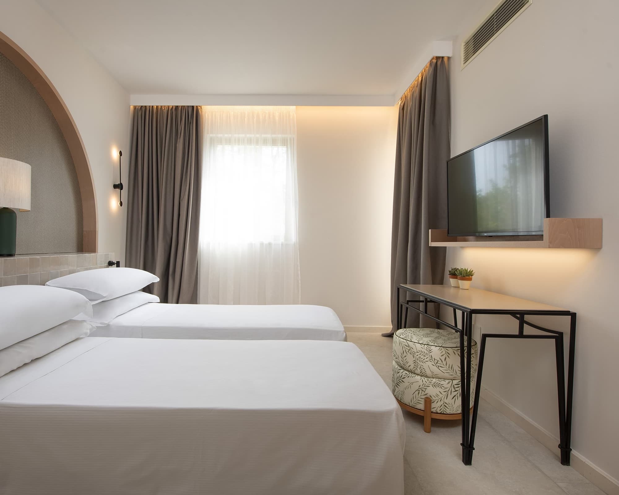 • Ogni camera dispone di balcone o terrazza con vista giardino, bagno con doccia, asciugacapelli e pesapersone, telefono, Smart TV satellitare a schermo piatto con connettività on demand (accesso a Netflix, Amazon Prime etc. con il proprio account), cassaforte, climatizzazione regolabile, bollitore per caffè/tè, minibar (allestimento su richiesta, a pagamento). Tutte le camere sono non fumatori.